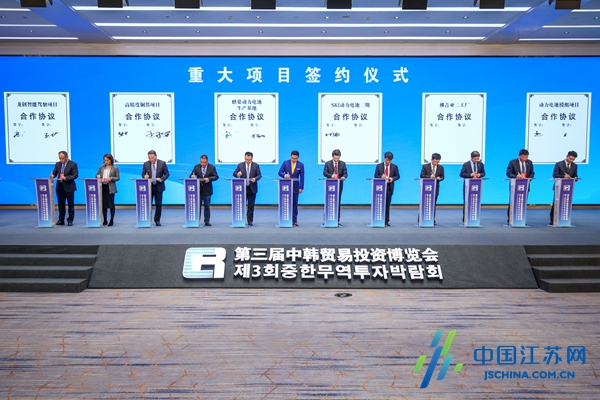 今年的第三届中韩贸易投资博览会,现场集中签约24个项目,总投资893亿元。其中外资项目8个,总投资33.9亿美元,协议注册外资12.1亿美元;内资项目15个,总投资676亿元;跨境电商合作协议项目1个。盐城经济技术开发区在会上签约项目8个,包含外资项目3个、内资项目5个,总投资382.6亿元。其中,总投资25.3亿美元的SKI动力电池二期项目,是盐城有史以来最大的利用外资项目。