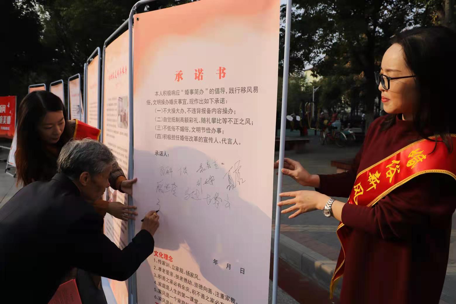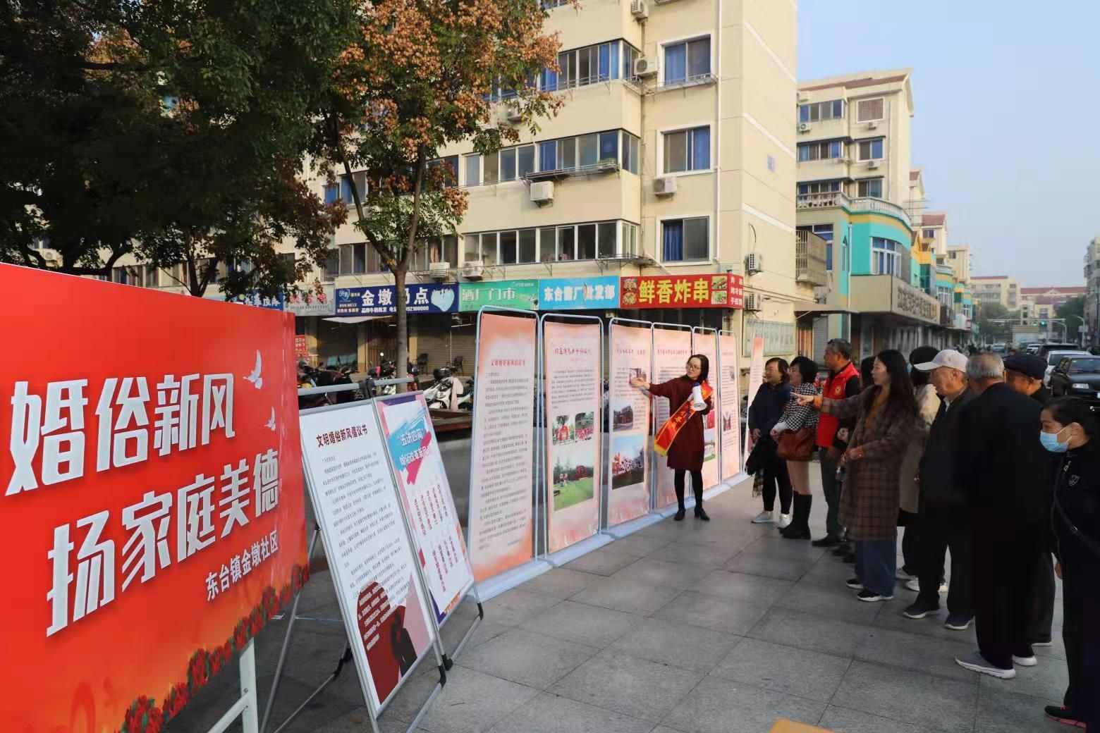 11月1日,东台市东台镇金墩社区举行“弘扬家庭文明新风 共创社区美好生活”主题活动,倡导文明婚俗新风。在幸福小广场,图文并茂的宣传展板、百姓名嘴面对面婚俗改革宣讲、知识竞答、居民同签婚俗新风倡议书等,吸引居民眼球,唱响“积极向上、简约文明”婚俗意识的主旋律。