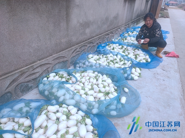 中国江苏网11月6日盐城讯 密壤深根蒂,风霜已饱经。秋去冬来,又到了萝卜集中上市的季节。田间小路,阡陌纵横,走在其间,近望远眺,田间地头,成片萝卜田地里,到处是村民采收地萝卜的身影,他们将拔起的萝卜装入箩筐,扛在肩上向田边走来,乡村道路边,洗萝卜、卖地萝卜的棚子随处可见,运送萝卜的小三轮、摩托车来来往往,村民们现场交易的吆喝声与外地客商车辆的喇叭声交织在一起。11月5日上午,久负盛名的盐城市射阳县四明镇曙光社区白萝卜基地一派热闹景象。