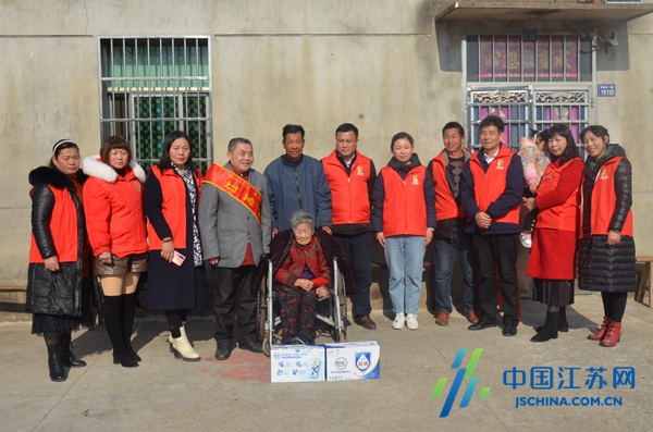 中国江苏网12月22日盐城讯 “郭老太,我们是镇‘好人’志愿者服务队队员,首先祝您健康长寿……”12月21日上午10点多钟,盐城市射阳县长荡镇“好人”志愿者服务队负责人杨红萍带领“中国好人”、该镇敬老院院长周守伟,“江苏好人”、该镇卫生院盲人推拿医师董少成,第八届“最美射阳人”——“最美创业精英”孙华,第八届“最美射阳人”提名奖获得者朱忠成、赵宝丽和第五届“最美长荡人”李洪巧等志愿者,在该村党总支书记吴相瞵的陪同下,来到了该村一组百岁老人花文春的家中,不但现场相互切磋“孝经”,而且还问寒问暖,给老人送去牛奶和慰问金。