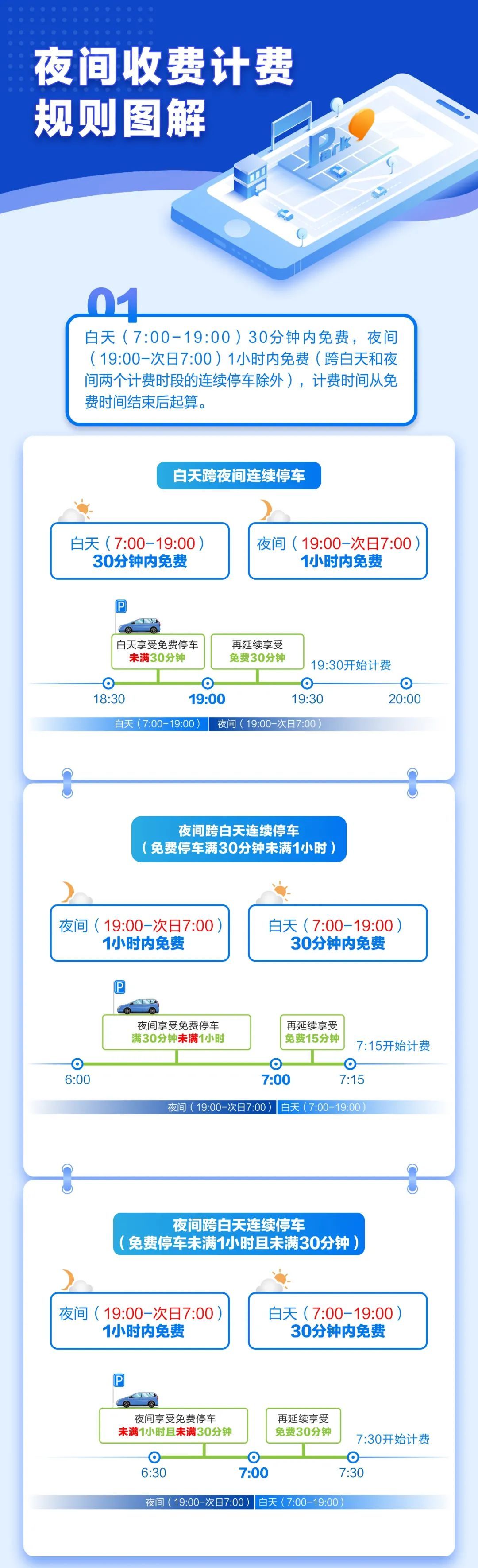1.白天(7:00-19:00)30分钟内免费,夜间(19:00-次日7:00)1小时内免费(跨白天和夜间两个计费时段的连续停车除外),计费时间从免费时间结束后起算。