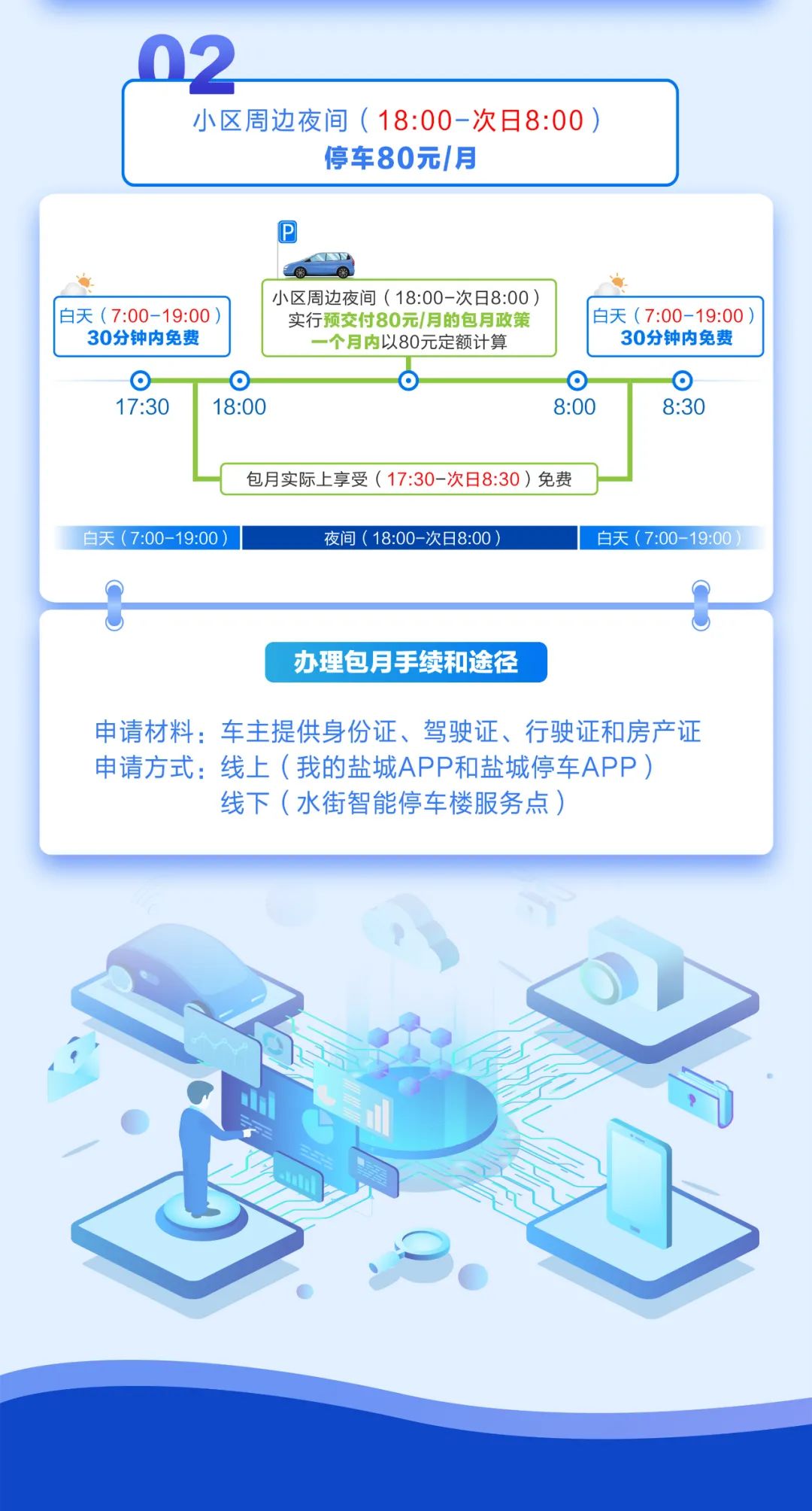 3.小区周边夜间(18:00-次日8:00)停车80元/月。