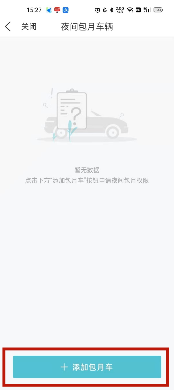 第二步:添加包月车进入“夜间包月车辆”页面→点击底部“添加包月车”按钮→填写和上传申请材料→点击“提交”按钮。