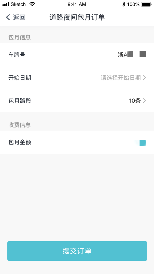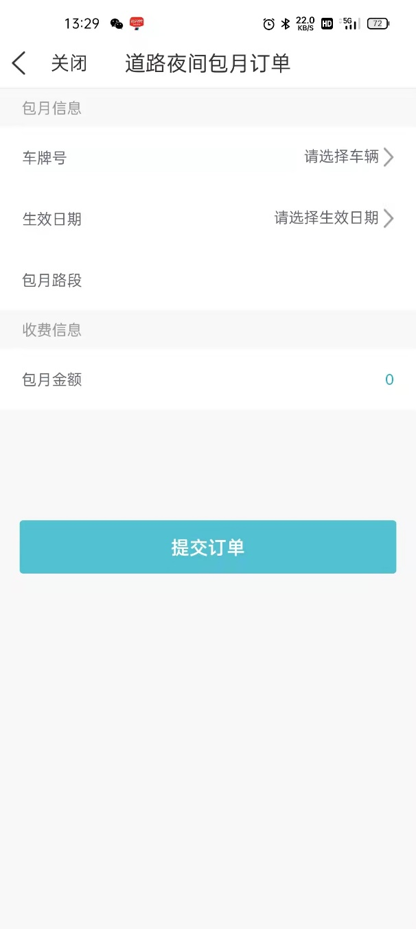 第四步:购买夜间包月进入“购买夜间包月”页面→点击底部“购买夜间包月按钮”按钮→进入提交购买订单页面→选择车牌号、包月开始日期→提交订单并支付包月费用,包月时长默认1个月。