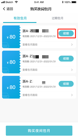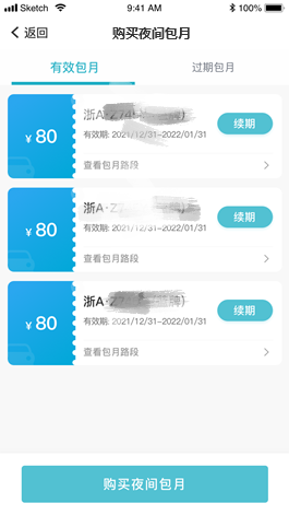 第六步:包月续期点击包月车的“续期”按钮→进入“道路夜间包月订单页面”→选择开始日期→提交订单并支付包月费用,即可完成续期。(注:续费不可选择车车牌,开始日期不能和原来包月日期重复)