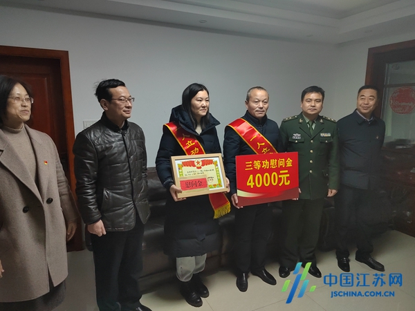 中国江苏网2月16日盐城讯 2月14日下午,伴随着阵阵喜庆的锣鼓声,在醒目的“热烈祝贺我区房林栋同志荣立三等功”的横幅下,盐南高新区人武部部长欧洪标一行将喜报送到现役军人房林栋父母手里。