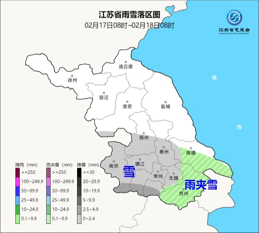 沿江和苏南地区阴有雨夹雪转小雨,其它大部分地区阴有小雪转雨夹雪或小雨。