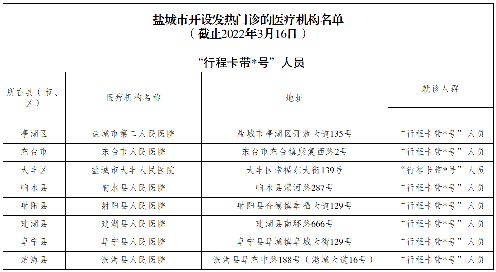 其他有新冠十大症状的“行程卡带*号”人员,应当至定点发热门诊就诊,盐城市第二人民医院为大市区定点发热门诊,其他县(市、区)人民医院为当地定点发热门诊。