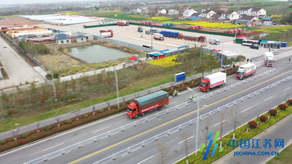 中国江苏网3月28日盐城讯 3月27日下午3时40分,沈海高速东台出口南侧一公里新建的涉农车辆集中转运场内,7辆满载着东台优质农产品的大货车缓缓驶出,即将去往上海。车前,“东台菜篮子 直供大上海”10个红色大字分外显目。