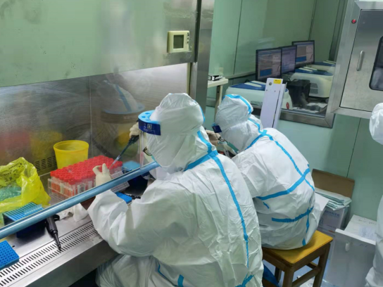 3月25日深夜,建湖县人民医院PCR实验室里依旧灯火通明,身穿防护服的他们正在“全副武装”地忙碌着。签收、录入、试剂准备、提取、加样、扩增、出具报告……核酸样本检测工作正紧张有序地进行中。随着疫情防控工作量的日益增加,核酸检测标本量也急剧增多,最高的一日达10000余管。在不耽误常规医学检验工作的前提下,该院检验科全员轮岗连轴转,24小时不停歇,穿着厚厚的防护服,专注而熟练地进行样本检测,在实验室里夜以继日争分夺秒,确保第一时间出具核酸结果。