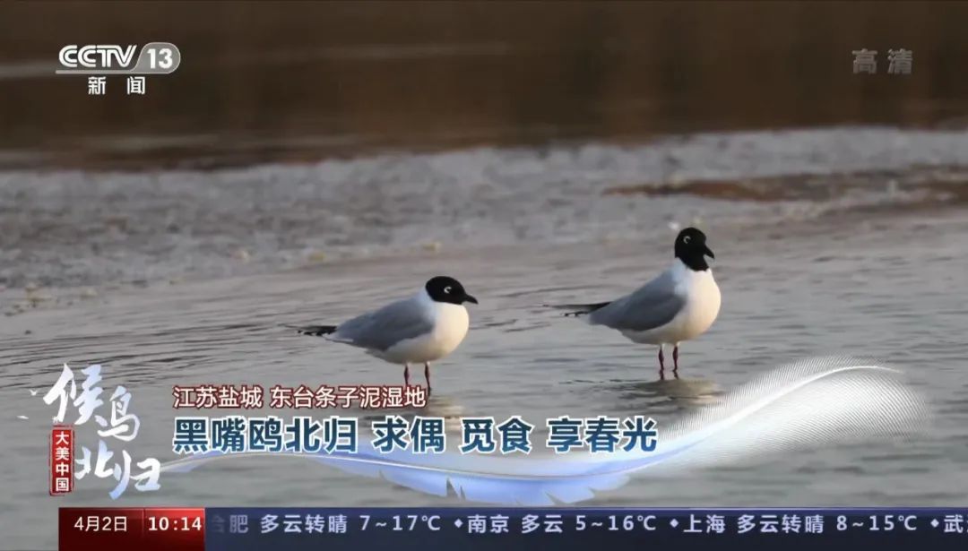 4月2日,央视新闻聚焦盐城,《大美中国 候鸟北归》直播国家一级保护动物黑嘴鸥的迁徙。头戴黑礼帽,身穿白礼服,浑身玉羽银翎,在阳光下如同盛开的黑蕊白花。