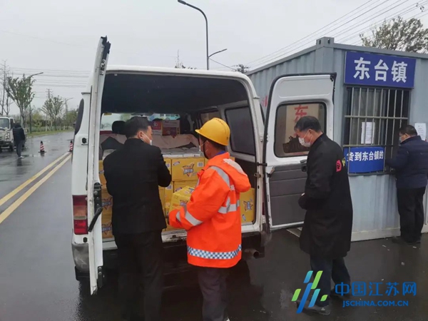 4月13日,东台镇线缆产业园的江苏鑫友盛智能制造科技有限公司管理部经理吴长明一行,购买了矿泉水、方便面等90箱生活物资,带领志愿者一同前往G15高速卡口看望一线抗疫工作人员,感谢他们夜以继日地奋战在疫情防控第一线,为人民群众“守好门”“把好关”。