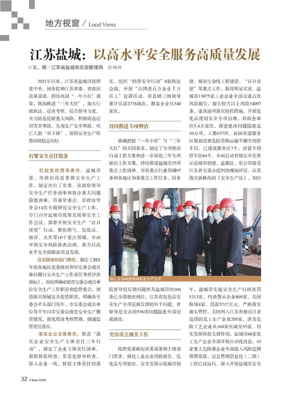 中国江苏网6月9日盐城讯《中国安全生产》杂志2022年第5期刊登文章《江苏盐城:以高水平安全服务高质量发展》长篇介绍盐城市以高水平安全服务高质量发展特色做法和主要成效。
