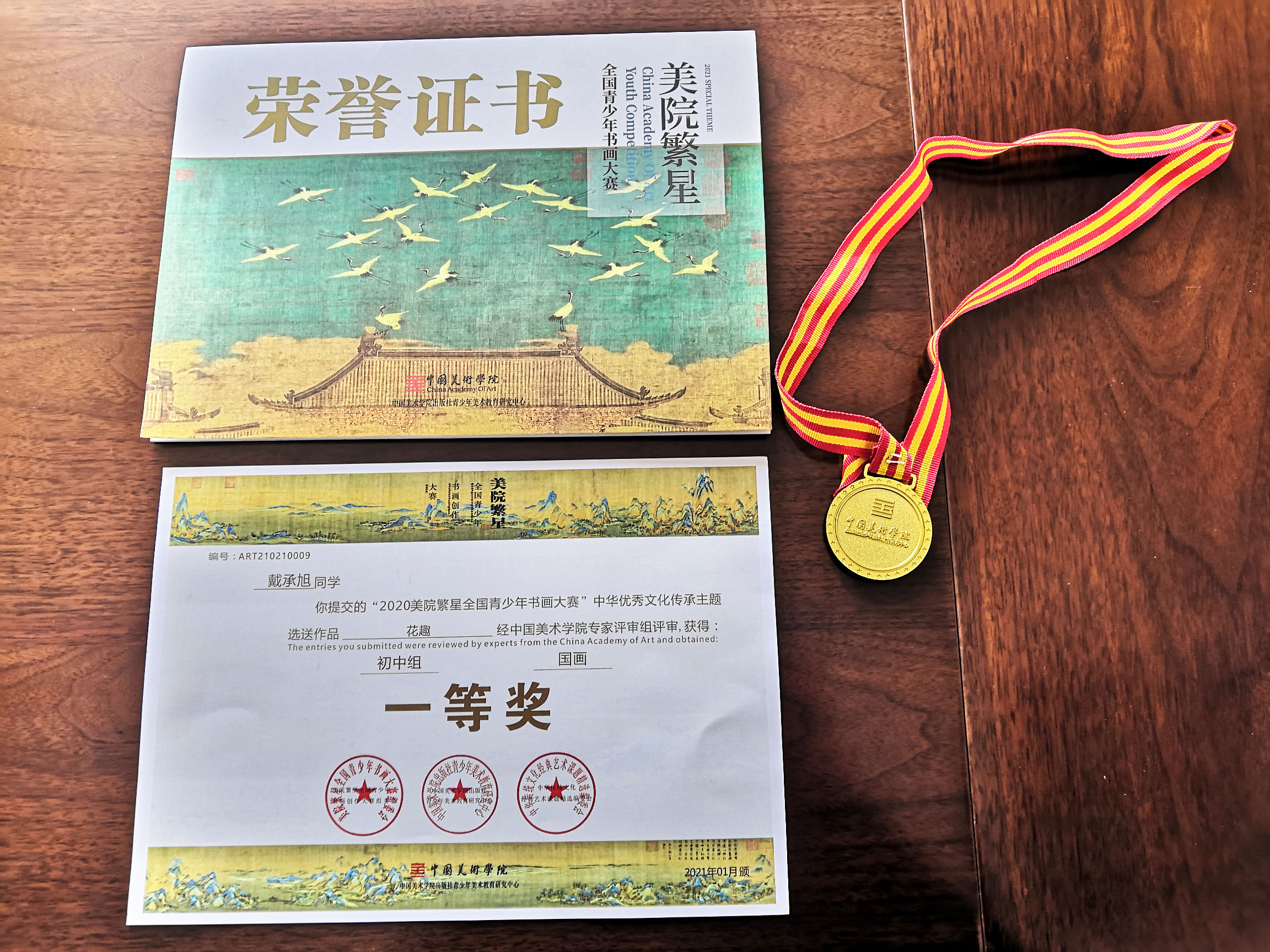 “乍暖还寒,万物复苏,桃李争妍,迎春报喜。可爱的小松鼠在枝头尽情嬉闹、玩耍,好似新奇,好似渴望,好似期盼……”戴承旭的母亲向记者介绍了儿子这幅《花趣》国画作品的寓意,预示着迎来一个美好的春天!专家认为,正是因为画面简洁生动,构图完整,具有强烈的感染力,《花趣》才能在众多同年龄段、同类别作品中脱颖而出,获得“2020美院繁星全国青少年书画大赛”初中组一等奖。
