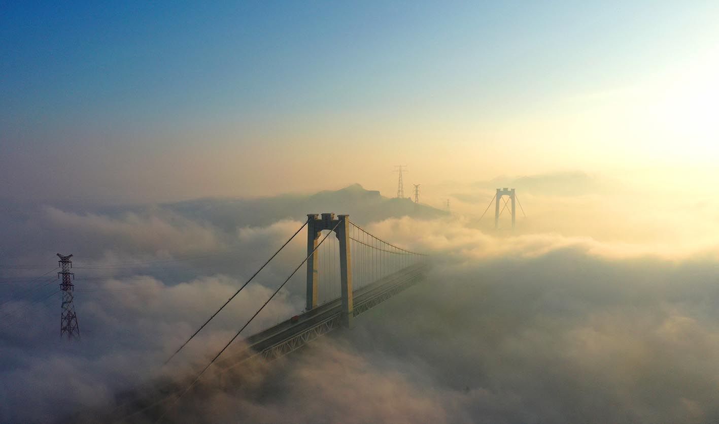 瘦西湖景区水雾缭绕,船在雾中行、人在雾中走,如同仙境;长江上,无人机升空穿过浓雾,在300米高空拍下晨雾中的五峰山长江大桥,壮观景象尽显。