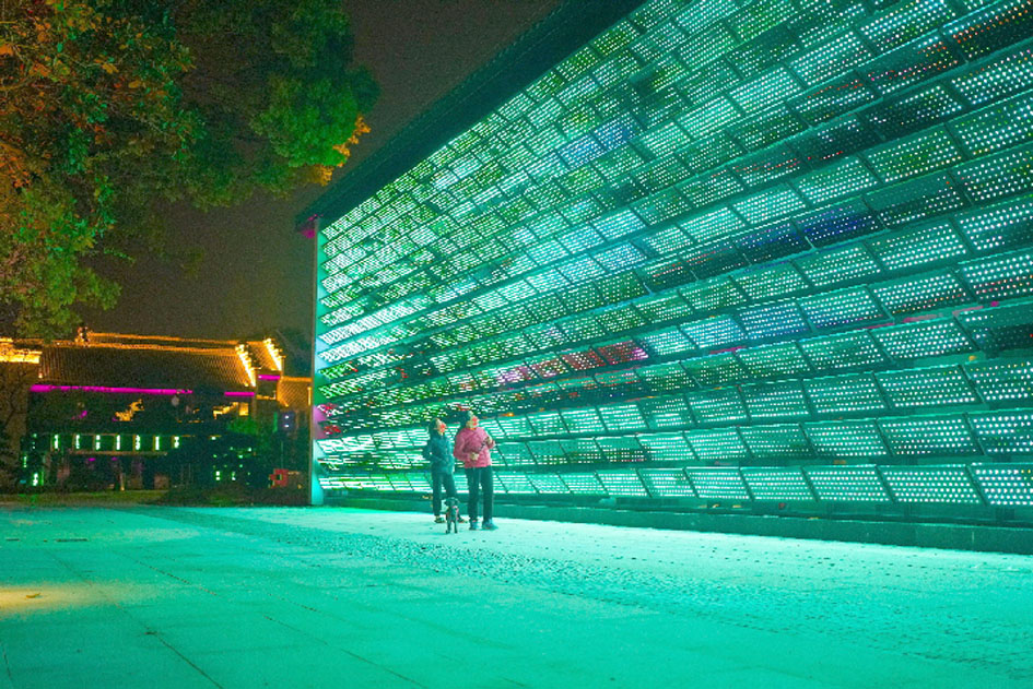 建筑体上,用LED灯墙组成的一幅幅生动光影画面,模拟“花、鸟、鱼、虫”互动现身;街区及园林景观灯采用了仿生学手法,打造出流光溢彩、美轮美奂的园区夜景,实现功能性照明与景观性照明的融合。