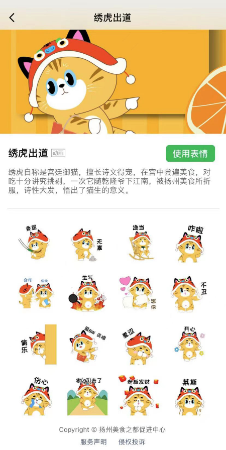 记者昨从扬州市商务局了解到,扬州美食IP形象“绣虎”日前在微信表情包正式“出道”。“绣虎”于去年底正式面世,最近,市世界美食之都建设促进中心又推出了“绣虎”的动图版表情包,一在微信上线,就受到不少网友追捧。