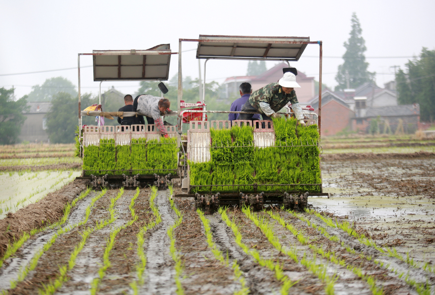 今天是夏至节气,江都区邵伯镇农民不误农时,抢抓晴好天气展开水稻秧苗栽插,加紧夏种夏管工作,确保秋后水稻丰产丰收。图为田间忙碌景象。李彬彬 孟德龙 摄