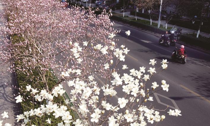 3月10日,镇江京口路沿途的几十株宝华玉兰、白玉兰盛开,成为沿途的一景。