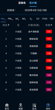 通过手机可查询各地污染因子浓度值、各乡镇(街道)排名情况