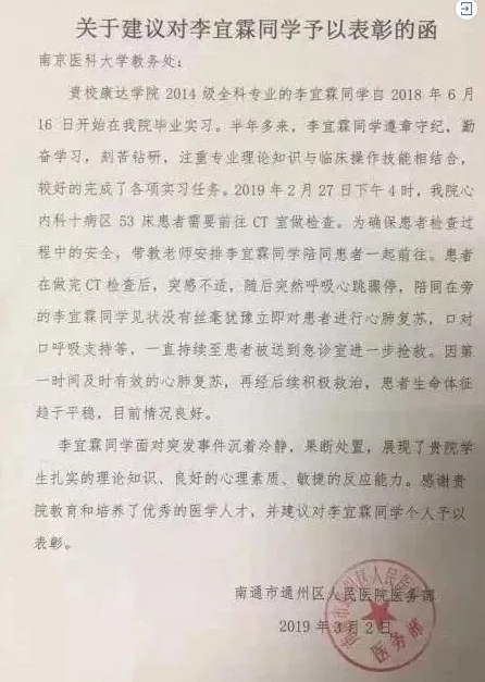 【“救人只是本分,不算见义勇为”】李宜霖,2014级临床医学专业学生。2019年2月27日正在实习的他通过紧急心肺复苏(CPR)挽救了患者生命。