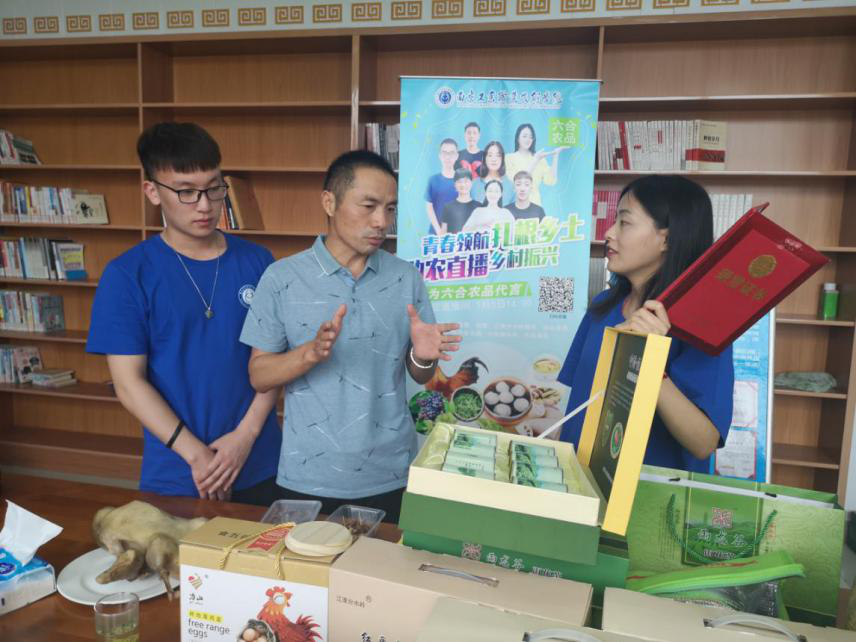 江淮分水岭籼稻、冶山贡鸡生态养殖基地、金牛湖的葡萄、峨嵋山的茶叶、东沟的盐水鹅、六合许氏蟹黄汤包……近日,南京工业职业技术大学国际教育学院“青年红色筑梦之旅”师生代表队上山头、下农田,全力帮扶六合区当地经济薄弱村农户开展特色农产品线上销售和推广活动,以“学生+农户”在线直播带货的形式,推荐江淮风水岭稻米、冶山贡鸡、金牛湖葡萄、东沟盐水鹅等六合特色农产品通过云端“飞”往全国各地,为农产品销售助力,从而助农富农,彰显出青年学子推动乡村振兴的社会责任和智慧担当。