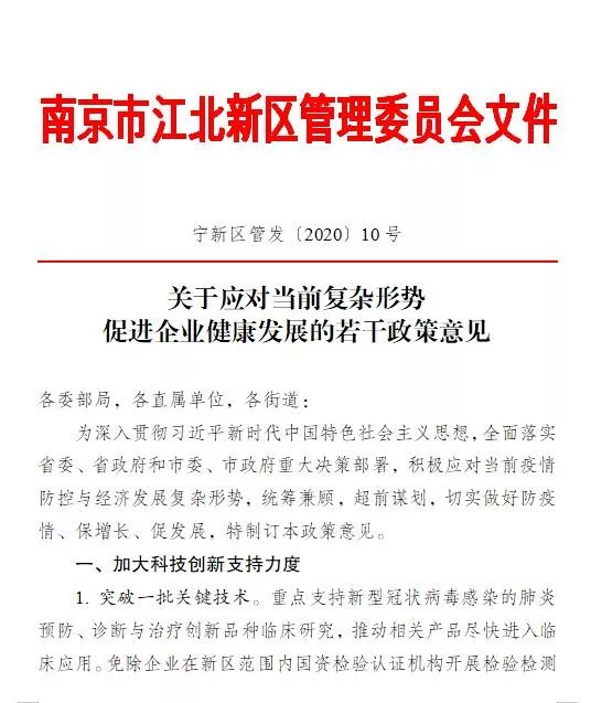 据了解,南京江北新区是国内首个发布应对疫情、促进企业健康发展的国家级新区。该政策执行期为2020年2月4日起6个月内有效。