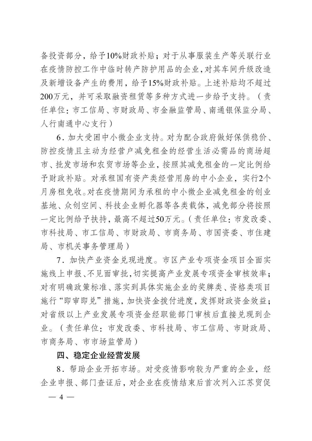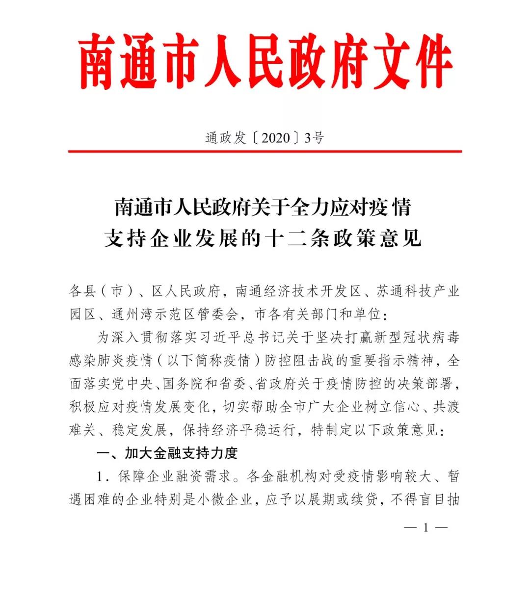 中国江苏网讯 为深入贯彻落实习近平总书记关于坚决打赢疫情防控阻击战的重要指示精神,全面落实党中央、国务院和省委、省政府关于疫情防控的决策部署,积极应对疫情发展变化,切实帮助企业树立信心、共渡难关、稳定发展,保持经济平稳运行,2月6日,南通市政府出台《关于全力应对疫情支持企业发展的“十二条”政策意见》(简称“克难惠企12条”)。