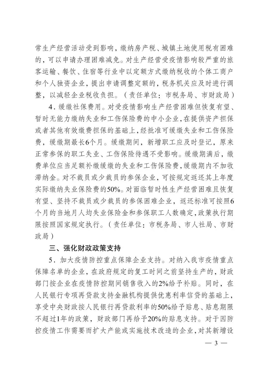 财政政策方面,意见从三个方面加大支持力度。一是加大对重点保障领域企业的支持。对纳入我市疫情重点保障名单的企业,对因疫情防控需要扩大产能或实施技改的企业,对临时转产防护用品的服装类企业,均有不同程度的财政补贴。同时,在享受优惠信贷利率的基础上,进一步给予企业贴息支持。二是加大对受困中小微企业的支持。对为配合政府做好保供稳价、主动为经营户减免租金的商超市场等企业,对为中小微企业减免租金的创业基地、众创空间、科技企业孵化器等各类载体,按照其减免租金的一定比例给予财政补贴。对承租国有资产类经营用房的中小企业,实行2个月房租免收。三是加快产业资金兑现进度。市区产业专项资金项目全面实施线上申报、不见面审批。对有明确政策标准、落实到具体实施企业的奖牌类、资格类项目施行“即审即兑”措施。省级以上产业发展专项资金审核后直接兑现到企业。