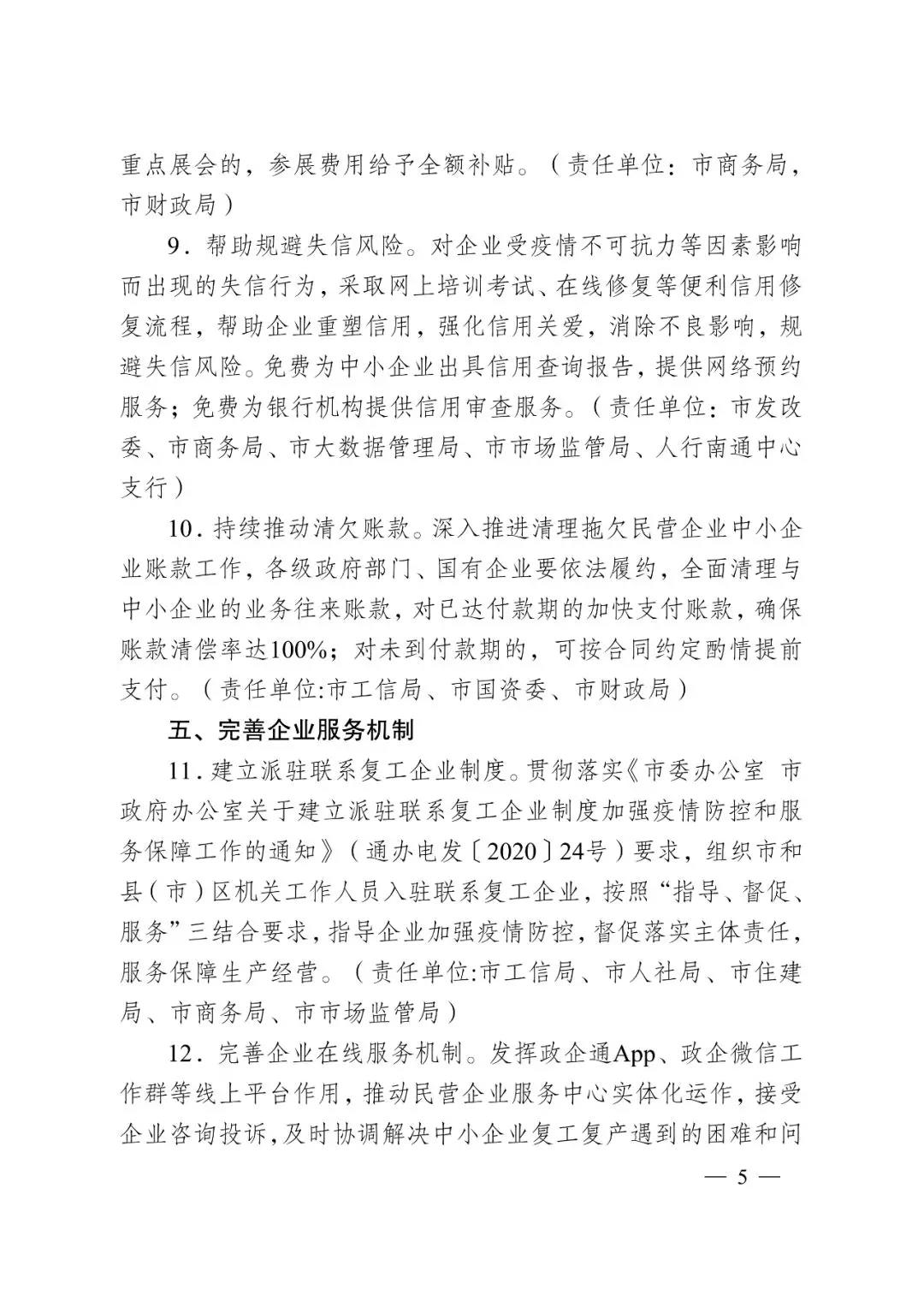 意见对进一步强化疫情防控期间企业服务工作提出新要求。一方面,建立派驻联系复工企业制度,组织机关工作人员入驻复工企业,指导加强疫情防控,督促落实主体责任,服务保障生产经营。另一方面,完善企业在线服务机制,在服务、审批、金融等方面,充分发挥政企通App、政企微信工作群、“全程电子化”审批平台、南通综合金融服务平台、南通创业融资服务平台等线上平台作用,及时为企业提供高效、便捷的线上服务。