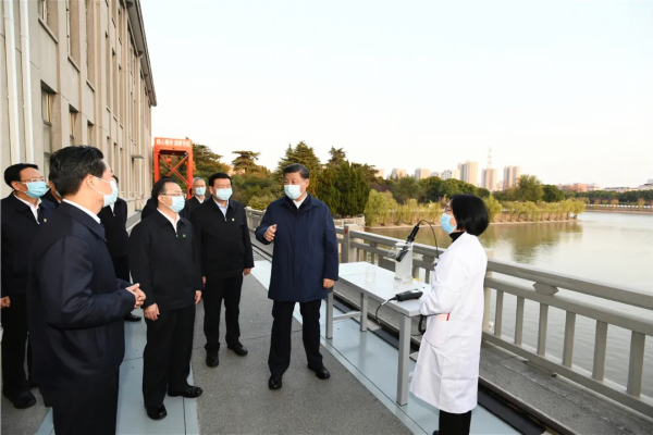 考察调研中,习近平来到展厅观看南水北调东线工程及江都水利枢纽专题片,结合沙盘听取南水北调东线工程建设运行情况介绍。他走进第四抽水站,察看抽水泵运行。在观测平台,工作人员向习近平展示了刚刚提取的水样,介绍当地加强水源地生态保护等情况。