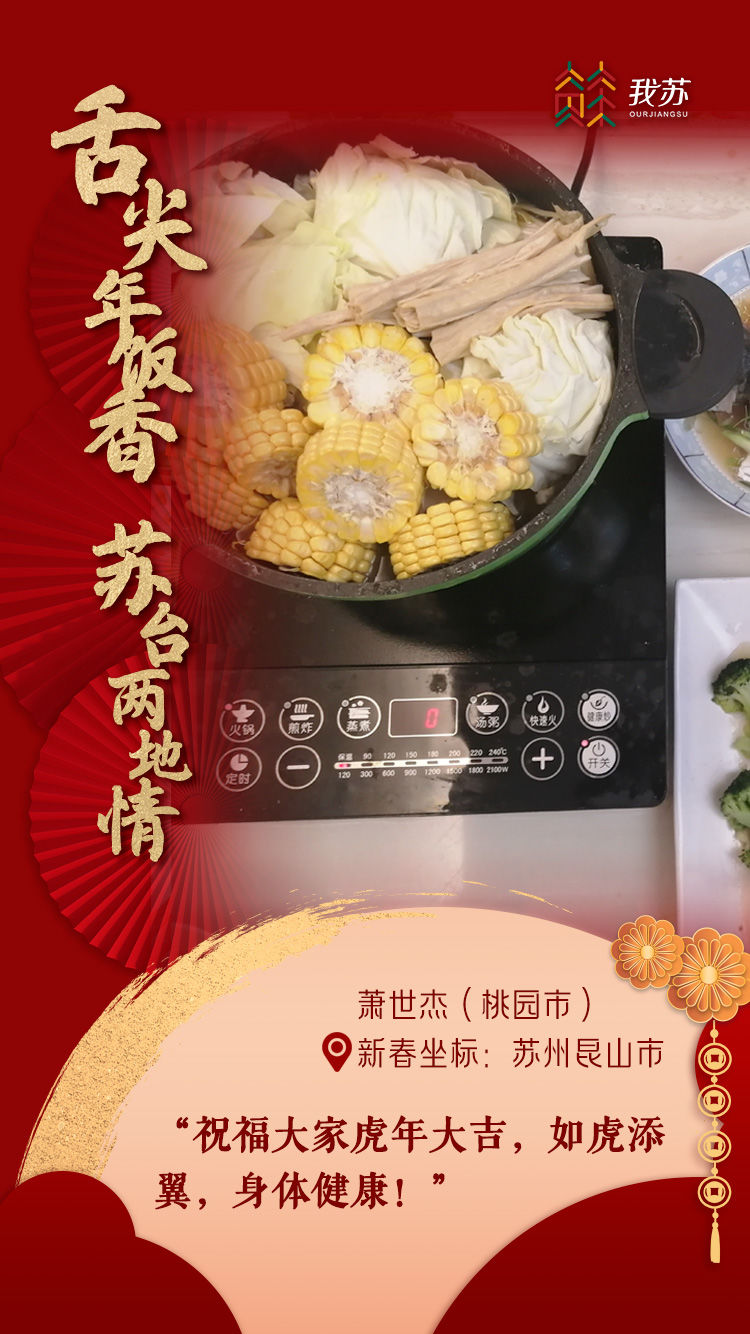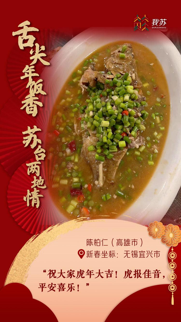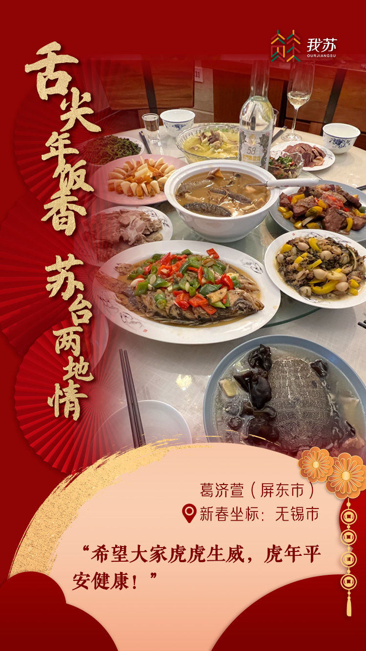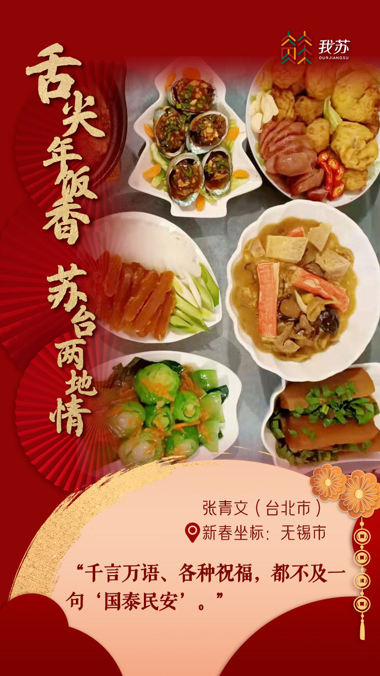“来江苏刚满十年,无锡这前后十年变化好大!每次回台,我都会想念这里,无锡就像是我的第二个娘家一样。今年,我选择做两岸应景年菜来过年:台湾麻油鸡、五味鲍鱼、苏北藕盒、台湾香肠、富贵花菜、烧酒虾、台湾乌鱼子、清蒸银鳕鱼、佛跳墙。岸的这一边是我和先生,岸的另一方是儿女和年迈的父母家人,离家越久就会越想念。食物就像是一条线,一端绑着生活,一端系着思念。每一份年菜都深藏着我们的思念,都是爱的幸福传递。”