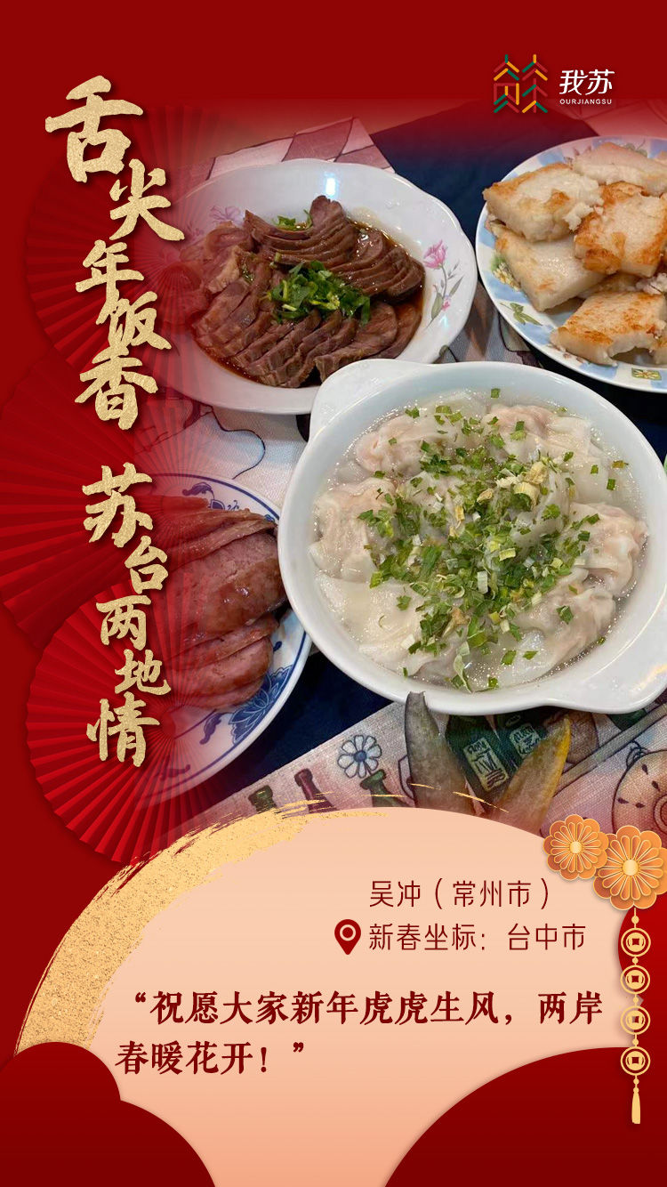 “常州和台中的城市气质很像,有环城的高架,也有‘咕噜咕噜’的BRT专线,都很注重老城厢与新城区的融合发展,还有文创雕琢城市品牌的匠心理念,两座城市有很多共同的频率段。今年我们的年夜饭餐桌很热闹!馄饨是金坛年夜饭食物,萝卜糕又名‘彩头’,是台湾常吃的食物,黄牛肉配镇江老陈醋是江苏特色吃法,猪蹄、笋干、卤蛋一锅卤和高粱酒火烧乌鱼子都是岛内特产。”