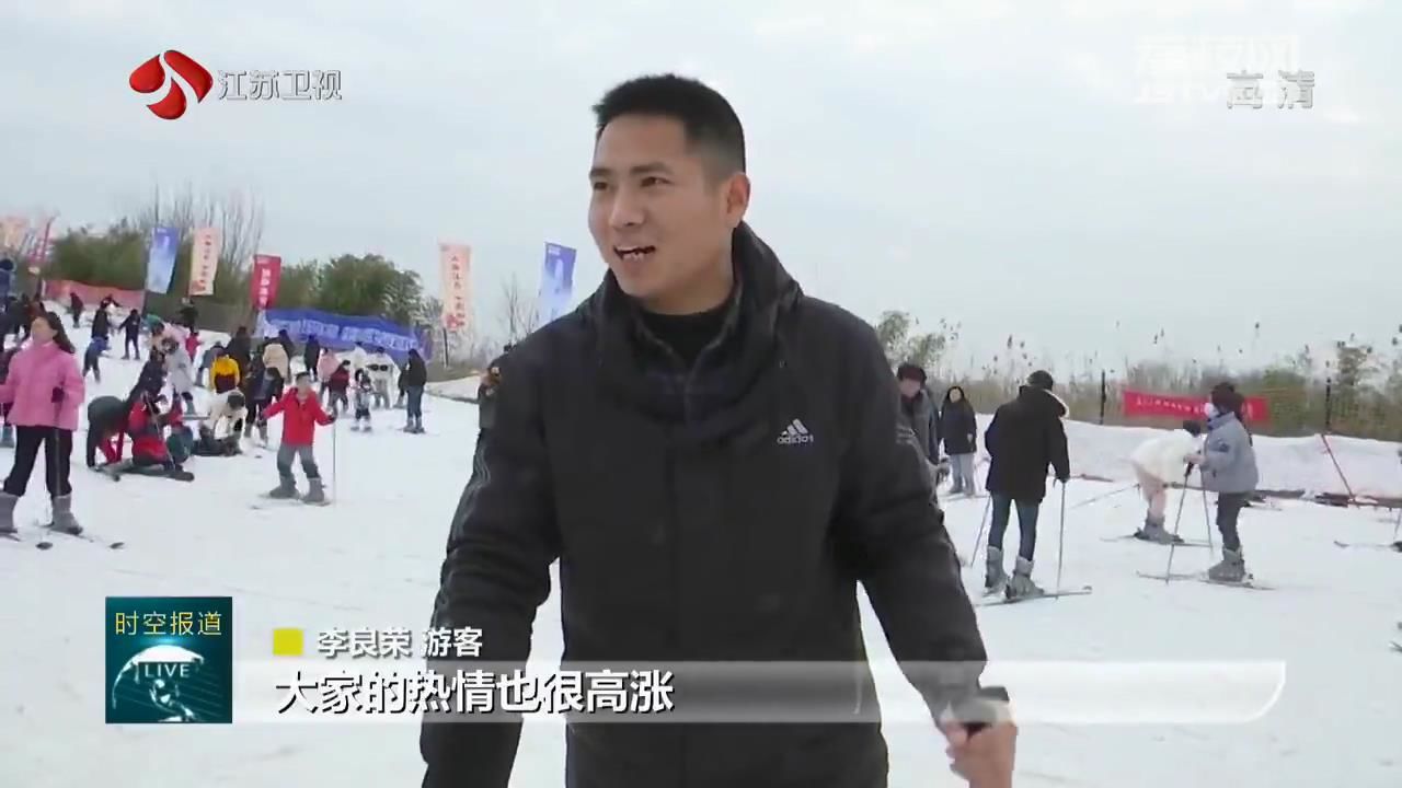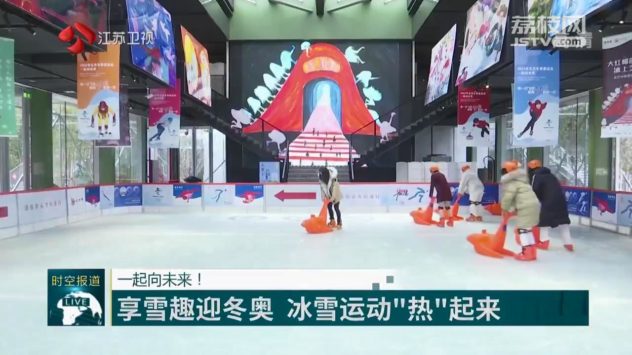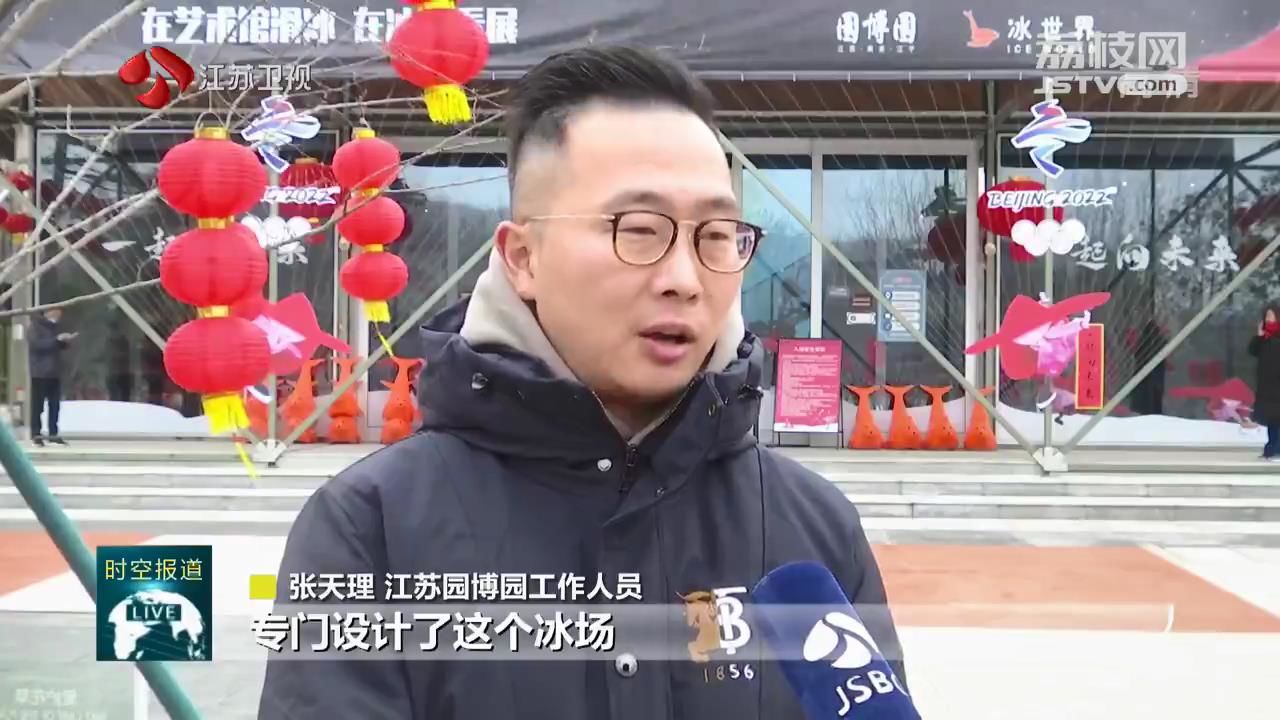江苏台记者郑伟说:“在南京,如何近距离感受‘冬奥时间’,解锁不同的冰上打开方式?江苏园博园的冰世界成了市民们春节期间的好去处。”