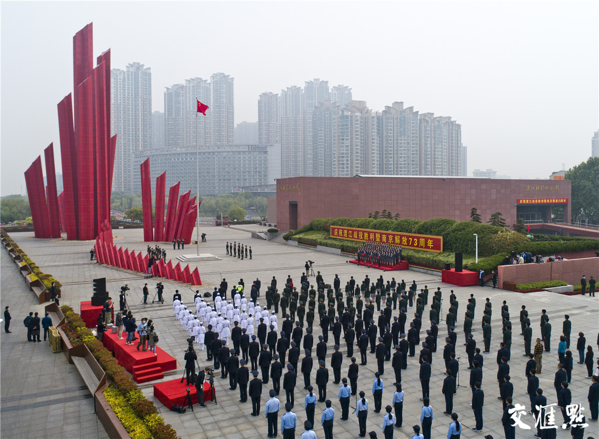 位于三汊河口的纪念馆渡江胜利纪念广场上,红色的“千帆竞渡”群雕巍然挺立,“庆祝渡江战役胜利暨南京解放73周年”的字样异常醒目。广场中央,南京市先进典型代表、驻宁部队官兵、公安机关、青少年学生、各界干部群众代表等整齐列队,庄严肃立。