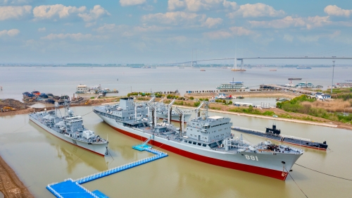 泰州大桥东南侧,如画美景中,泰州海军舰艇文化园静静伫立,“三舰一艇”风姿挺拔。