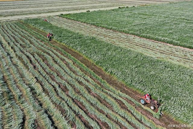 炎炎夏日,艾草迎来了丰收的季节。走进淮安市盱眙县桂五镇,只见连片的艾草鲜嫩繁茂、长势喜人,微风拂过,枝叶摇曳,散发出沁人心脾的艾香。眼下正是今年第一茬艾草的收割季,伴随着机器轰鸣声,大片大片的艾草被收割、晾晒,搂草机、打捆机将已经收割翻晒好的艾草翻起打捆。“艾草一年可采收三茬,5月上旬开始采收第一茬,现在基本采收差不多了。”种植大户吴义安说。