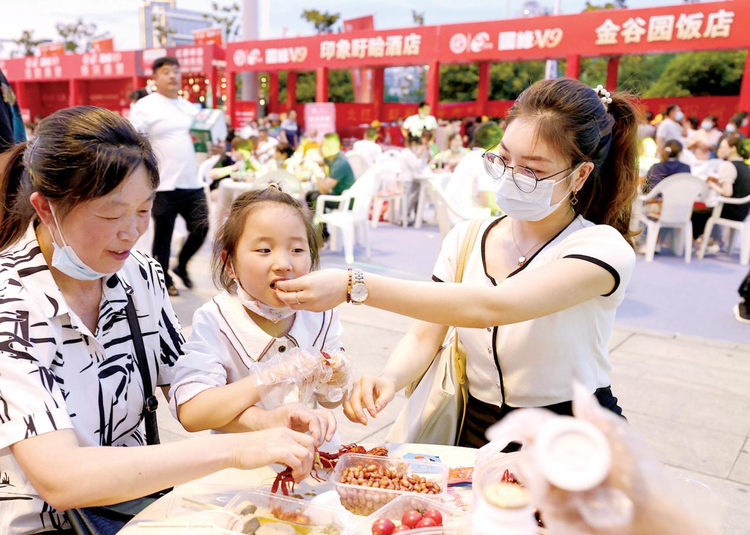 在刚刚过去的小龙虾消费旺季,盱眙各大夜市每天有近万人嗦虾,日均消费约10吨。“我是从山东德州过来的,听说盱眙龙虾非常好,专程开车600多公里来这儿吃虾,果然名不虚传。”田先生一边嗦虾一边竖起了大拇指。