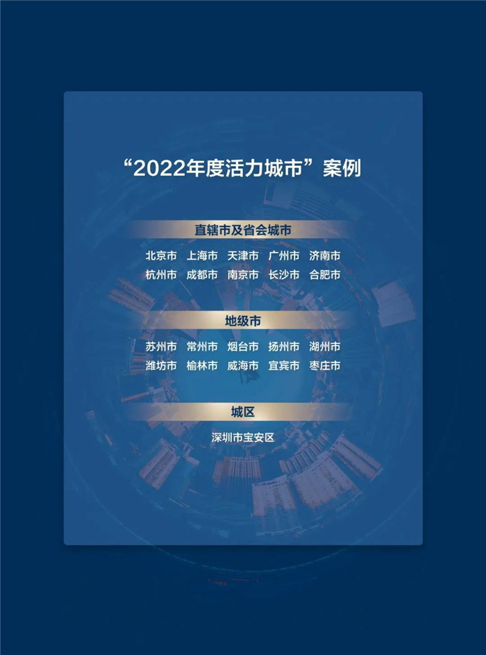 入选“2022年度活力城市”案例的地级市有:苏州市、常州市、烟台市、扬州市、湖州市、潍坊市、榆林市、威海市、宜宾市、枣庄市。
