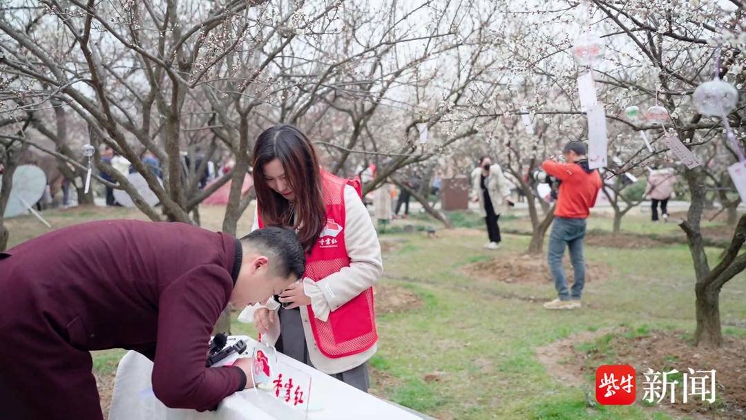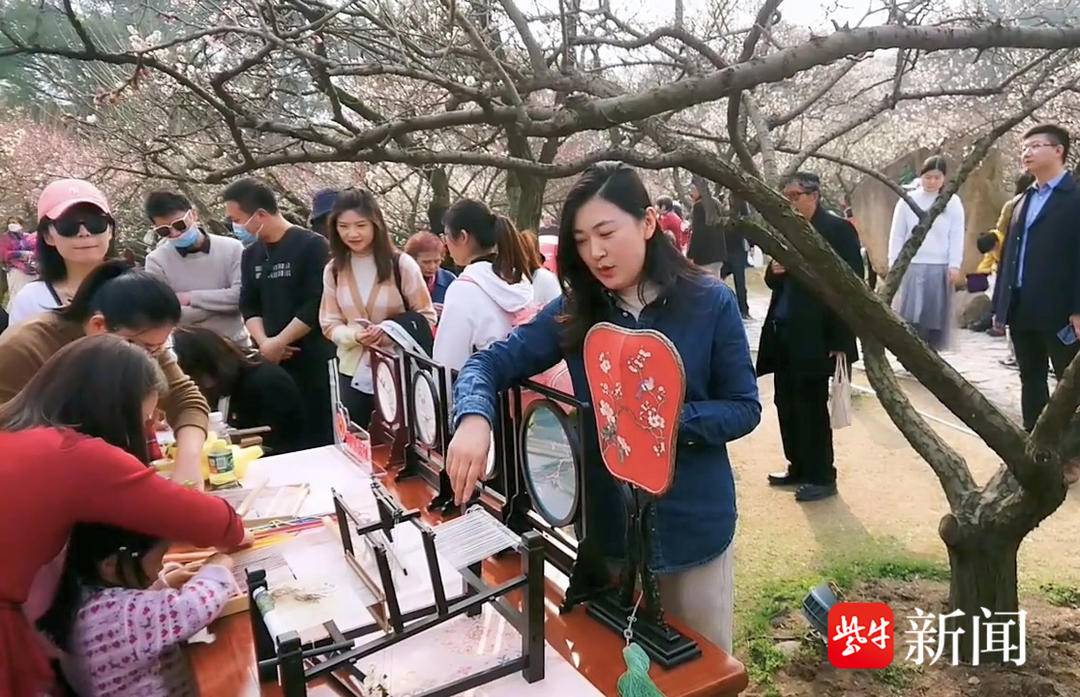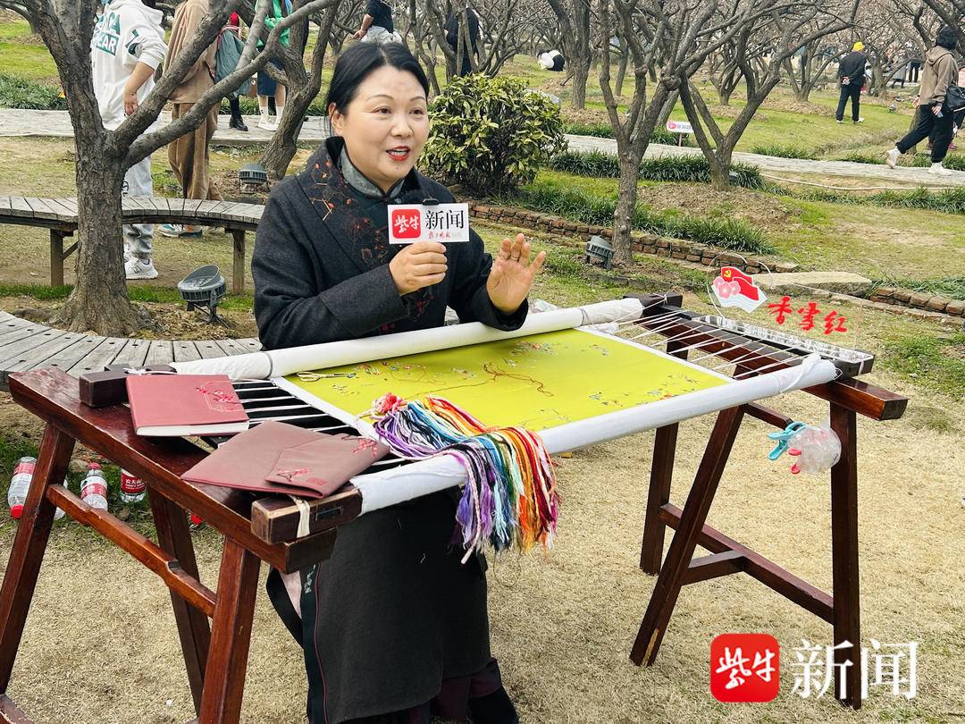 灿烂如霞的梅林下,直播活动特别邀请了国家级非遗项目苏绣(市级)代表性传承人府向红,吴中区青年手艺人协会副会长、秘书长徐学清等5位绣娘现场展示苏绣技艺,精湛的苏绣技艺和精美的苏绣作品吸引了众多游客围观点赞。