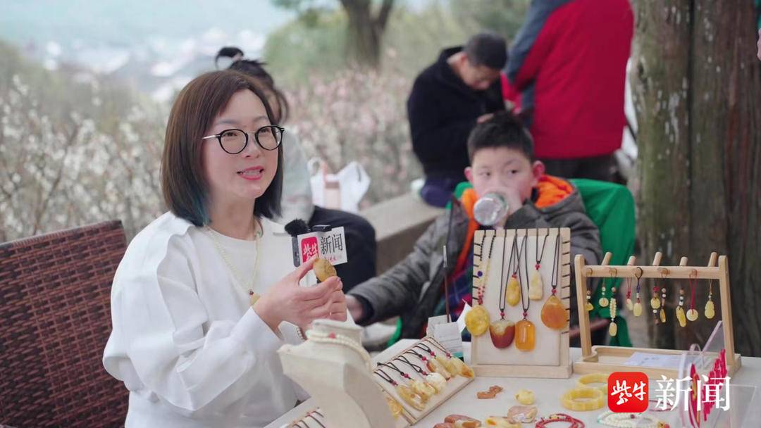 观景台现场,苏州(玉雕)吴中区非遗传承人钱建良为大家介绍梅花系列玉雕作品;吴中工匠黄兰英展示苏作琥珀蜜蜡雕刻作品,并现场设计梅花型图案雕刻蜜蜡。