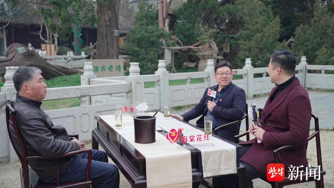 随后,主持人和导游来到香雪海景区对面的著名古迹司徒庙,这里以乾隆命名的“清、 奇、古、怪”四棵古柏树为著称。千年古柏树前,江苏省非物质文化遗产项目(木雕)代表性传承人钟锦德和正高级乡村振兴技艺师(红木家具)史志晔现场分享木雕作品,讲解雕刻知识。