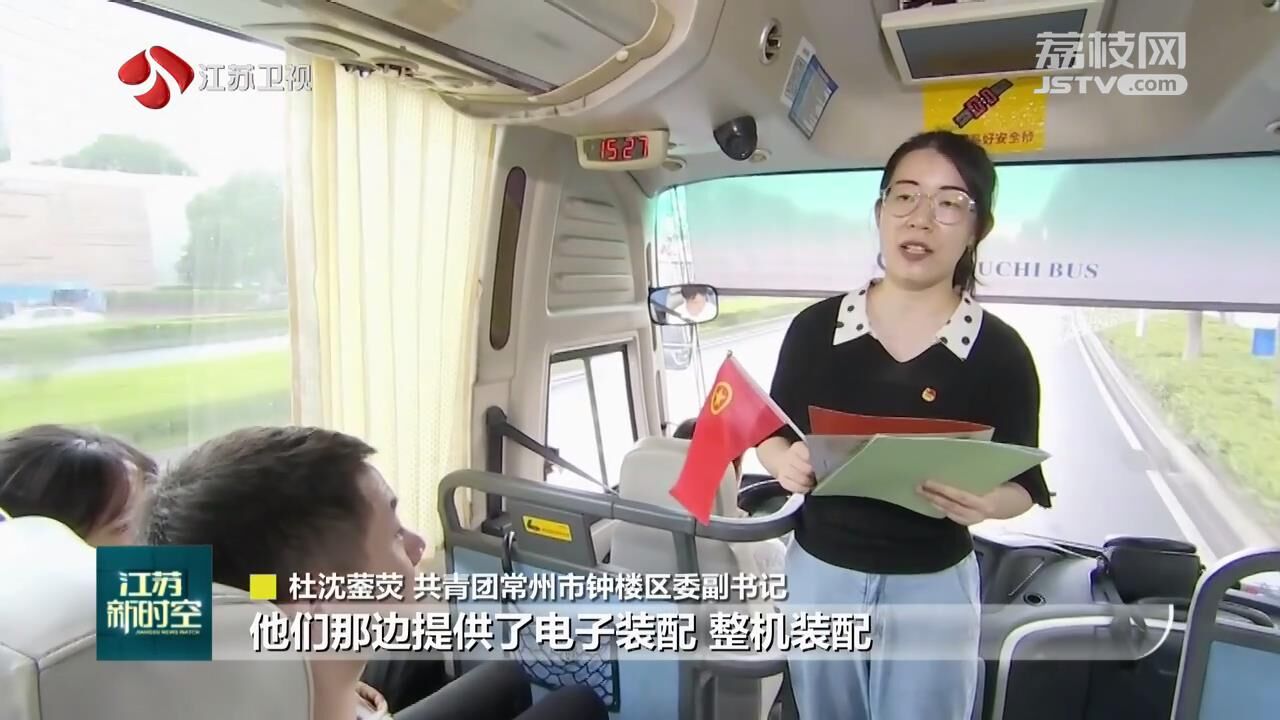 就业旅行大巴车上,共青团常州市钟楼区委副书记杜沈蓥荧向同学们介绍道:“我们特意选取了和同学们专业比较契合的公司,他们提供了电子装配、整机装配,还有数控操机这方面的岗位需求。”