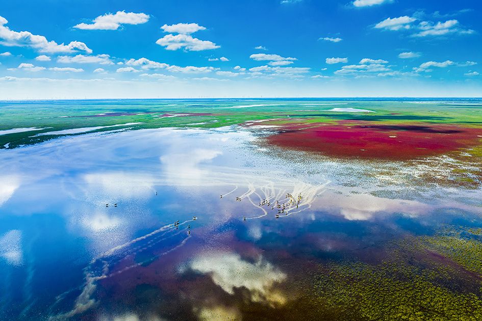 这里,有丹顶鹤翩翩起舞;这里,有野放麋鹿激情奔跑;这里,有四季花开争奇斗艳;这里,有广袤湿地气象万千……