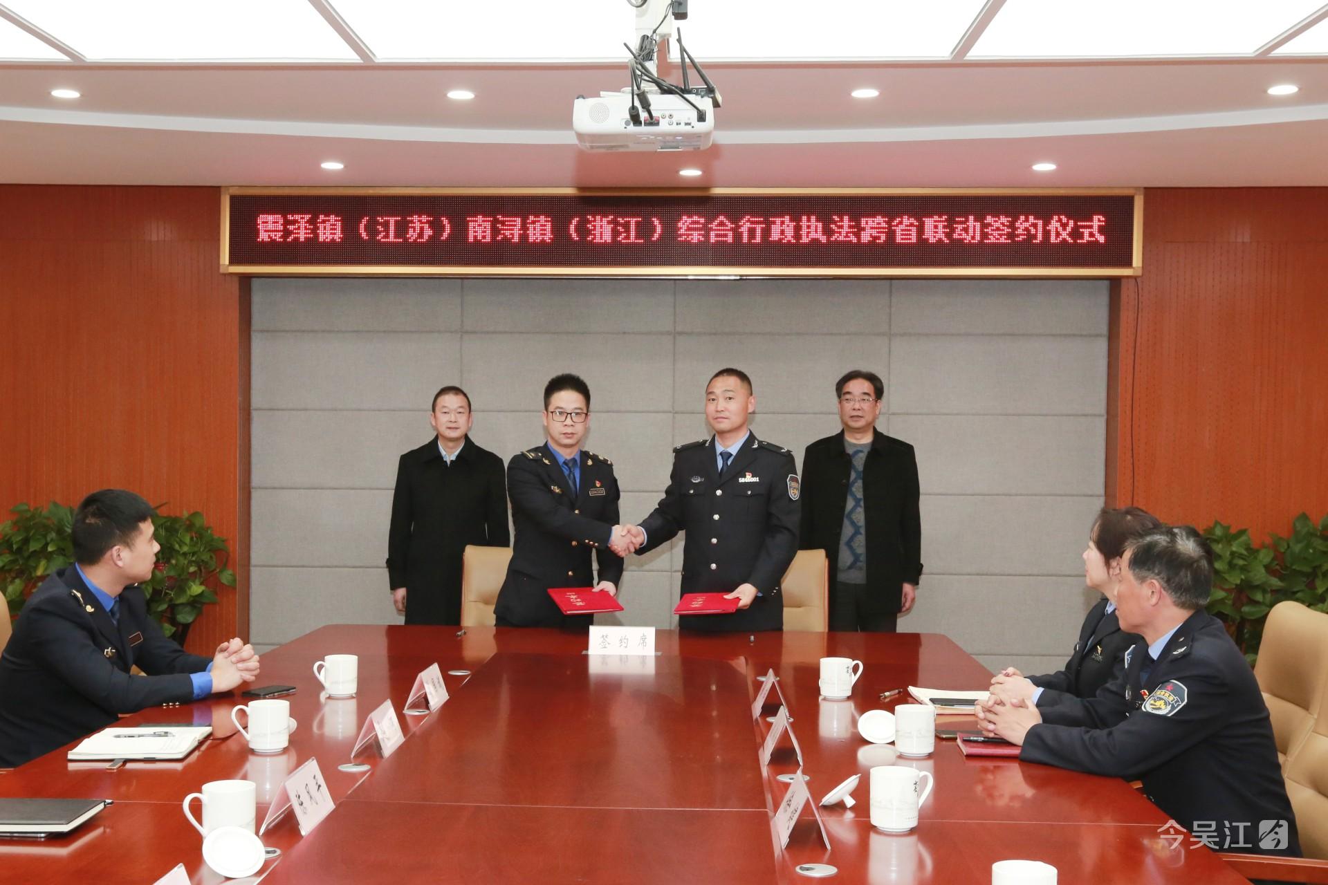 “近年来,震泽镇和南浔镇综合行政执法系统在跨区域联动上有着广泛的合作,多次开展业务交流和联动执法。”宋银海介绍,今年3月,震泽镇与南浔镇共同签署了《综合行政执法跨省合作协议》,旨在构建“经验互鉴、执法互动、信息互通、联席互商”的跨区域执法联动工作机制,实现常态化联合执法、案件移送等协作,打造多元共治新格局。