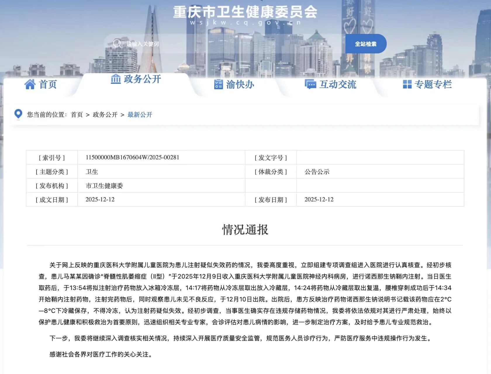 据重庆市卫生健康委专项调查组12日通报,针对网上反映的重庆医科大学附属儿童医院为患儿注射疑似失效药的情况,经初步调查,当事医生存在违规存储药物情况,将依法依规严肃处理。详情如下↓(央广网)