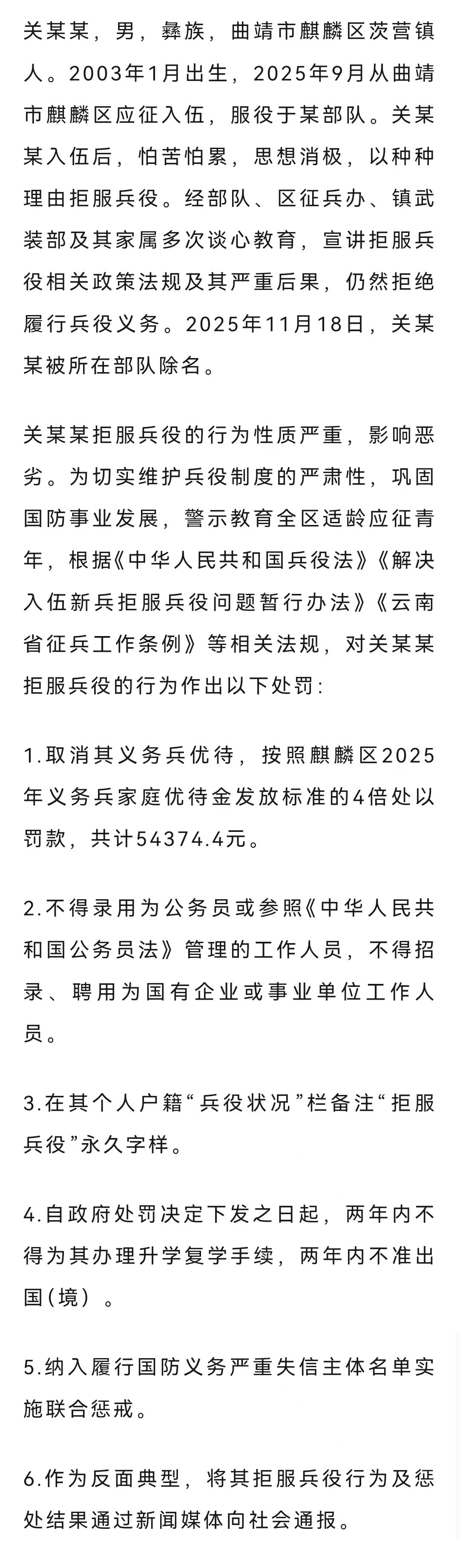4.关某某怕苦怕累拒服兵役,官方通报:17日,“云南曲靖征兵”微信公众号发布通报称,关某某2003年1月出生,2025年9月从曲靖市麒麟区应征入伍,服役于火箭军某部队。关某某入伍后,怕苦怕累,思想消极,以种种理由拒服兵役。经部队、区征兵办、镇武装部及其家属多次谈心教育,宣讲拒服兵役相关政策法规及其严重后果,仍然拒绝履行兵役义务。2025年11月18日,关某某被所在部队除名。根据相关法规,对关某某拒服兵役的行为作出以下处罚↓(“云南曲靖征兵”微信公众号)