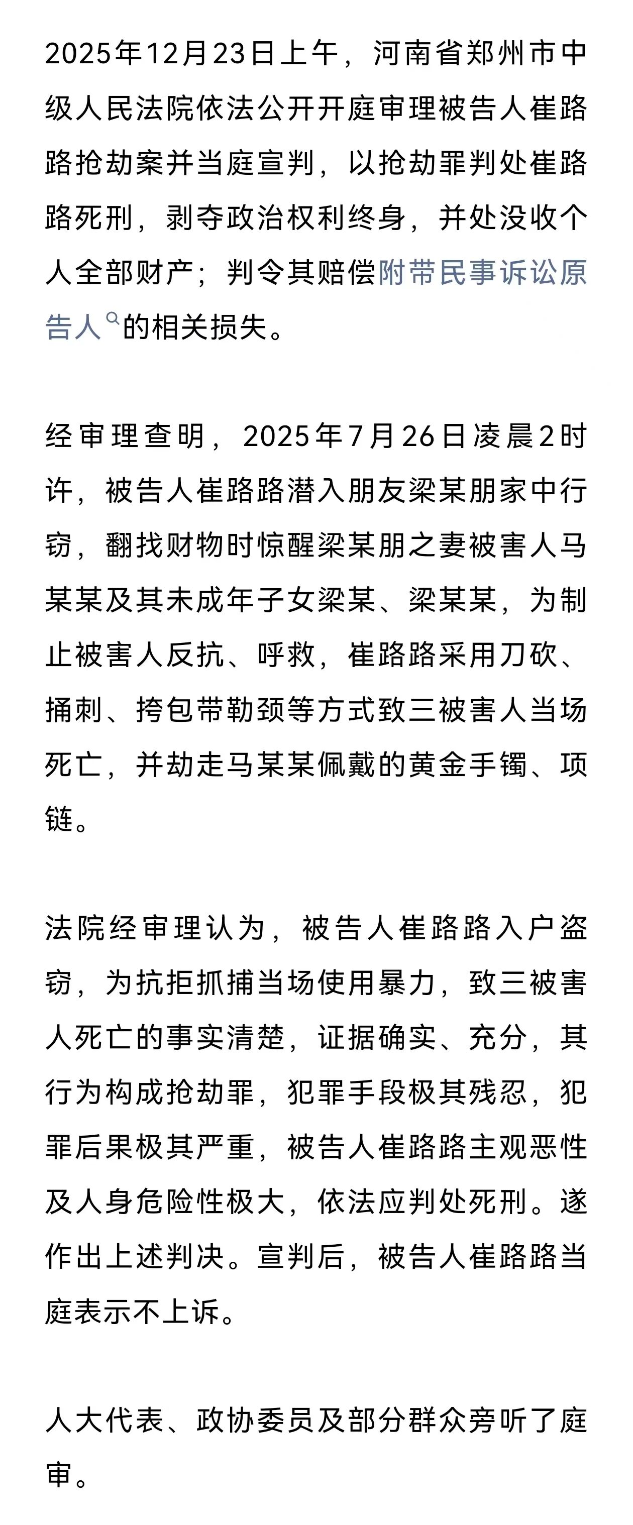 4.崔路路杀害发小妻儿3人,被判死刑:2025年12月23日上午,河南省郑州市中级人民法院依法公开开庭审理被告人崔路路抢劫案并当庭宣判,以抢劫罪判处崔路路死刑,剥夺政治权利终身,并处没收个人全部财产;判令其赔偿附带民事诉讼原告人的相关损失。详情如下↓(检察日报正义网)