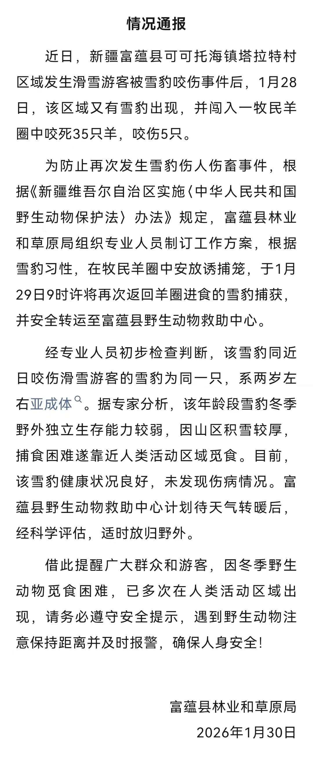 1月30日凌晨,新疆维吾尔自治区富蕴县林业和草原局发布情况通报,近日,富蕴县可可托海镇塔拉特村区域发生滑雪游客被雪豹咬伤事件后,1月28日,该区域又有雪豹出现,并闯入一牧民羊圈中咬死35只羊,咬伤5只。为防止再次发生雪豹伤人伤畜事件,根据《新疆维吾尔自治区实施〈中华人民共和国野生动物保护法〉办法》规定,富蕴县林业和草原局组织专业人员制订工作方案,根据雪豹习性,在牧民羊圈中安放诱捕笼,于1月29日9时许将再次返回羊圈进食的雪豹捕获,并安全转运至富蕴县野生动物救助中心。情况通报如下↓(人民网)