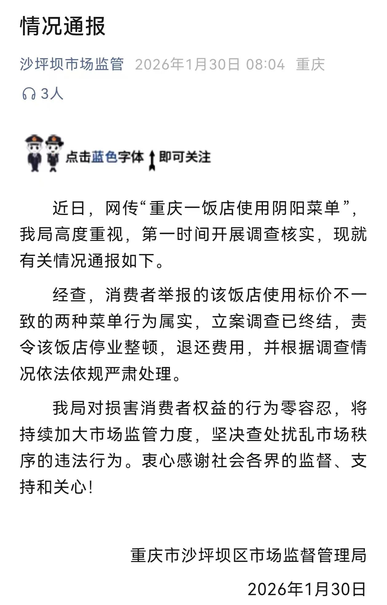 1月29日,有网民在社交平台发布视频反映,重庆市一家饭店疑似根据顾客口音使用“阴阳菜单”,同类菜品存在数十元差价,涉嫌对外地游客“宰客”等行为,引发舆论关注。重庆市沙坪坝区市场监督管理局1月30日就网传“阴阳菜单”事件发布情况通报,称涉事饭店违规行为属实,责令其停业整顿,并向消费者退还费用。情况通报如下↓(人民网)